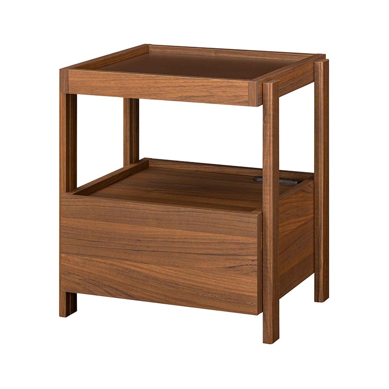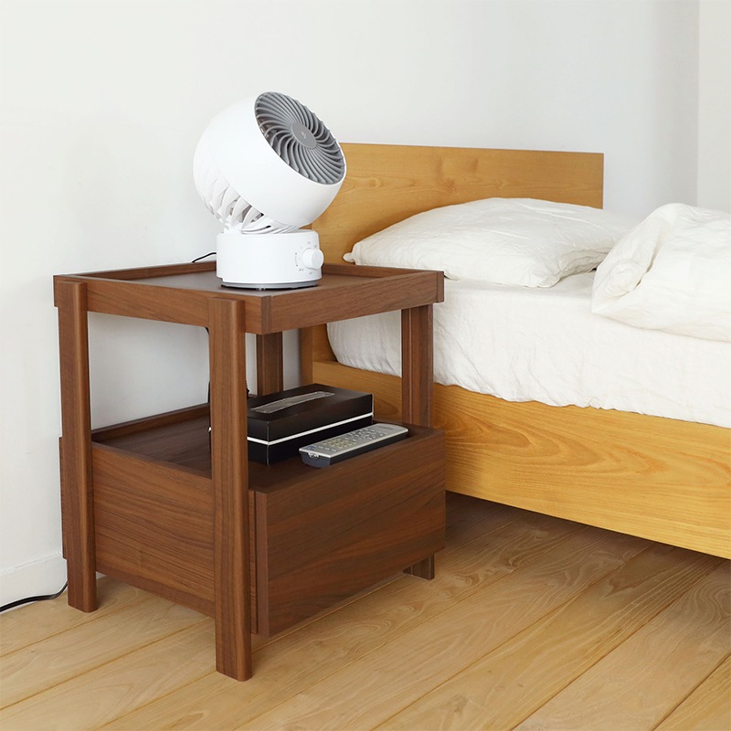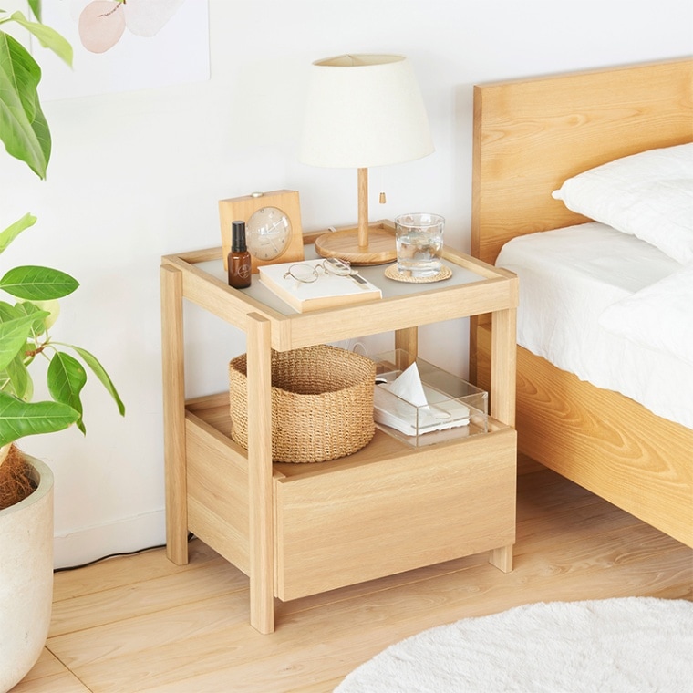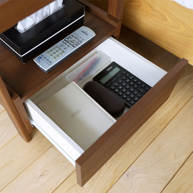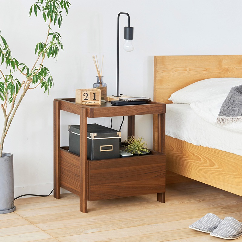 引き出し付きのサイドテーブル。軽快さを感じられるスクエアデザインで寝室の印象を整えてくれます。