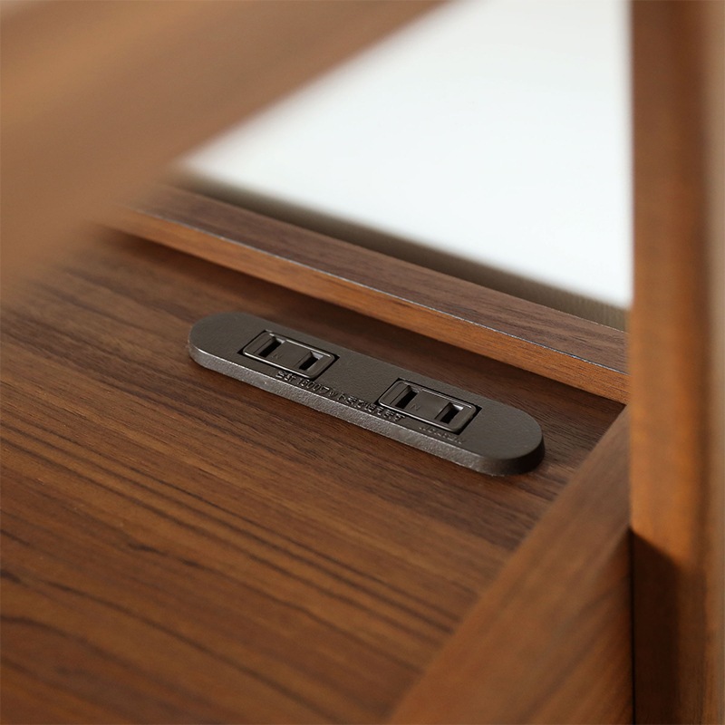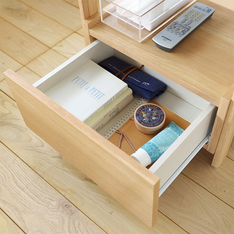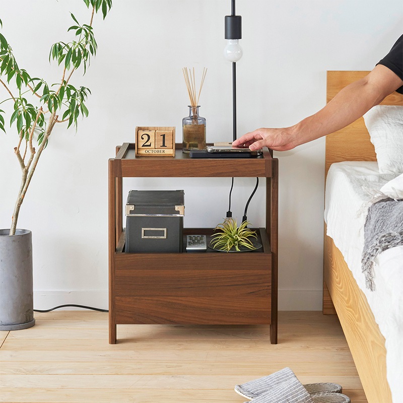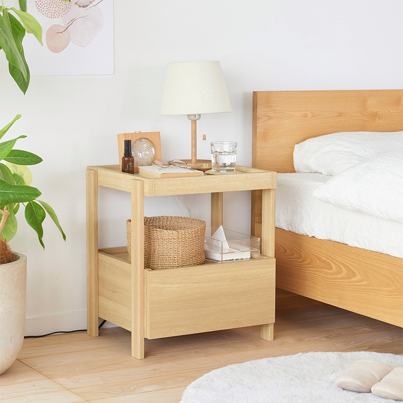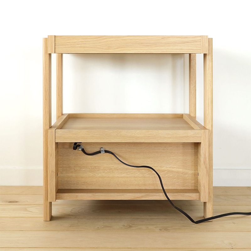 引き出し付きのサイドテーブル。軽快さを感じられるスクエアデザインで寝室の印象を整えてくれます。