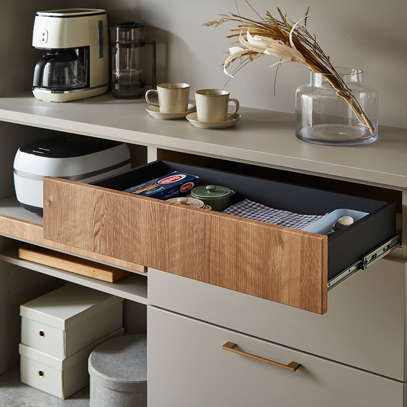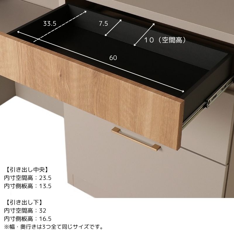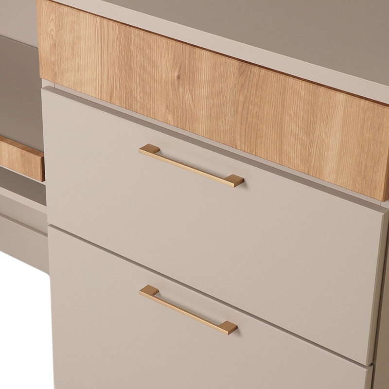 天板・表面材:MDF強化紙(マット調)、引き出し:フルオープンレール、ハンドル:真鍮