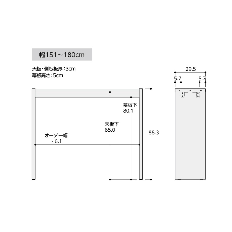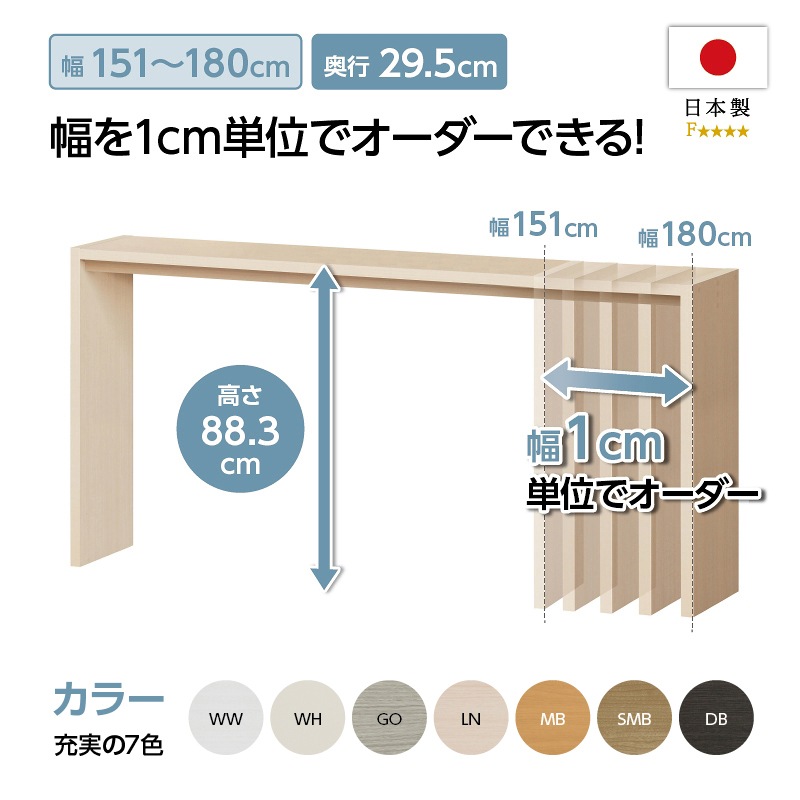 幅:151~180cm(1cm単位) 奥行:29.5cm 高さ:88.3cm