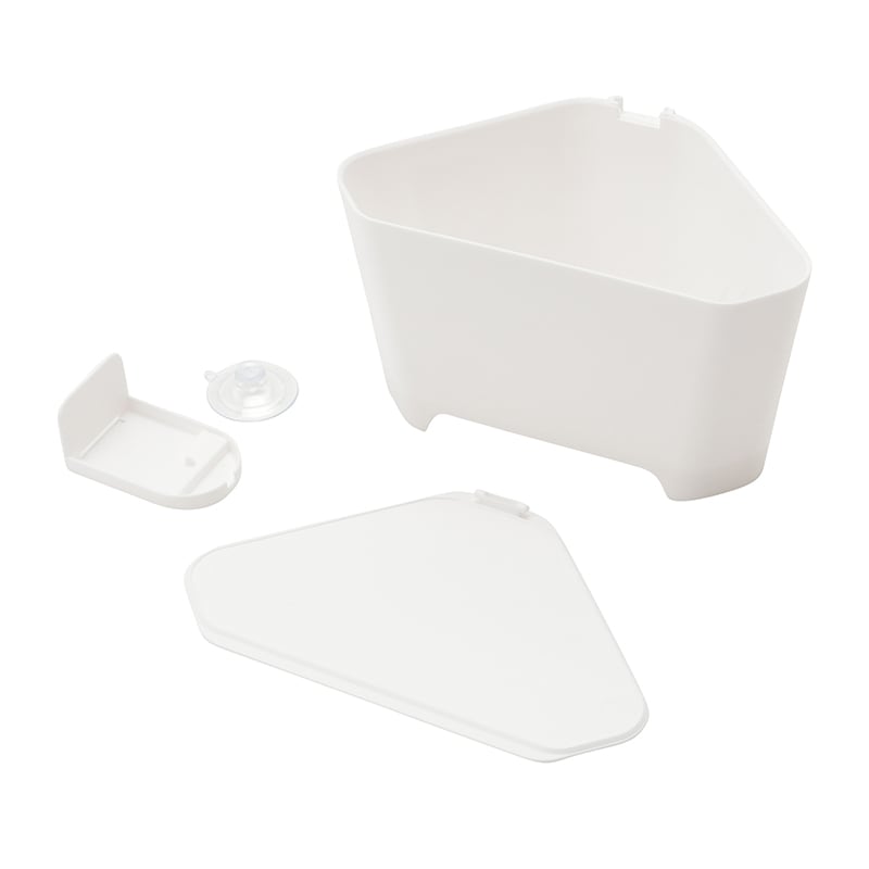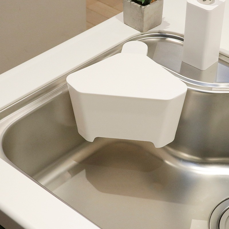 シンクの角に吸盤で簡単設置でき、浮かせて使用できる三角コーナー。