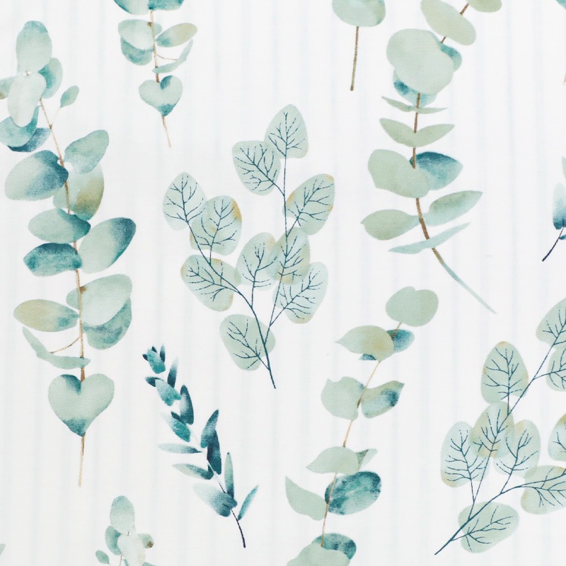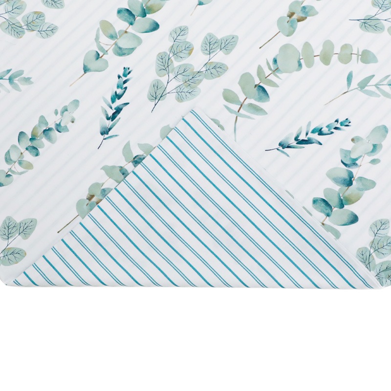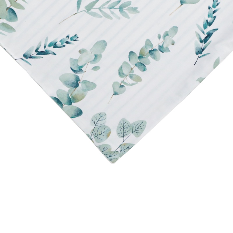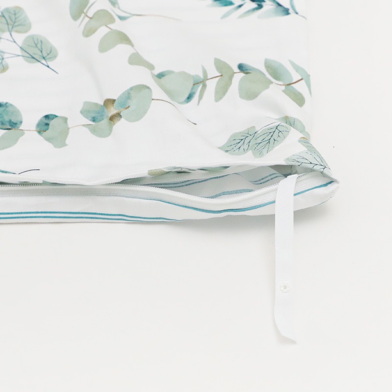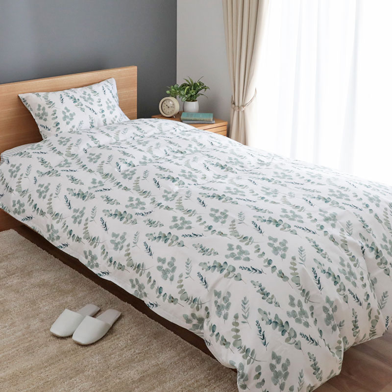 表面はユーカリ柄、裏面はストライプ柄とリバーシブルとなっており、どちらも涼しげに寝室を彩ります。