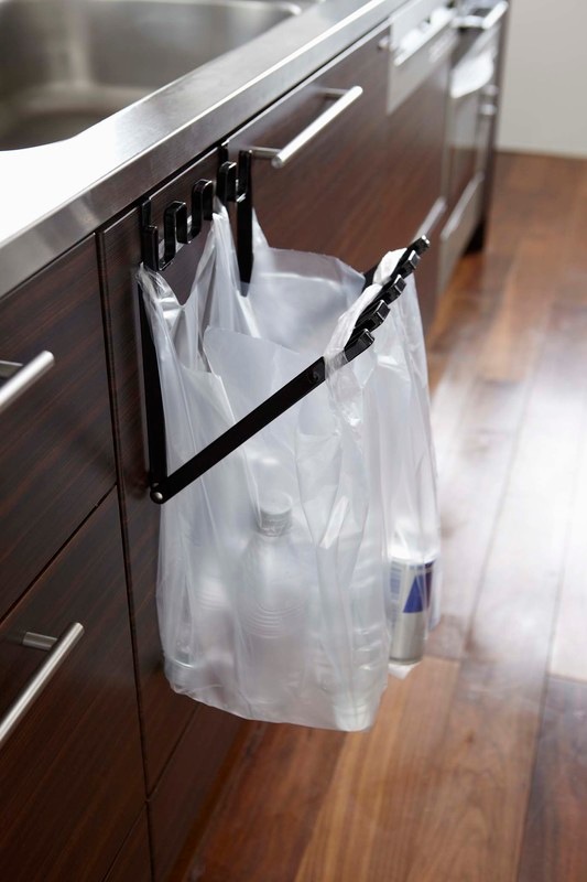 シンクのドアに設置してスーパーのレジ袋を引っ掛けるだけで調理中にでるゴミをそばでポイ!分別も可能。