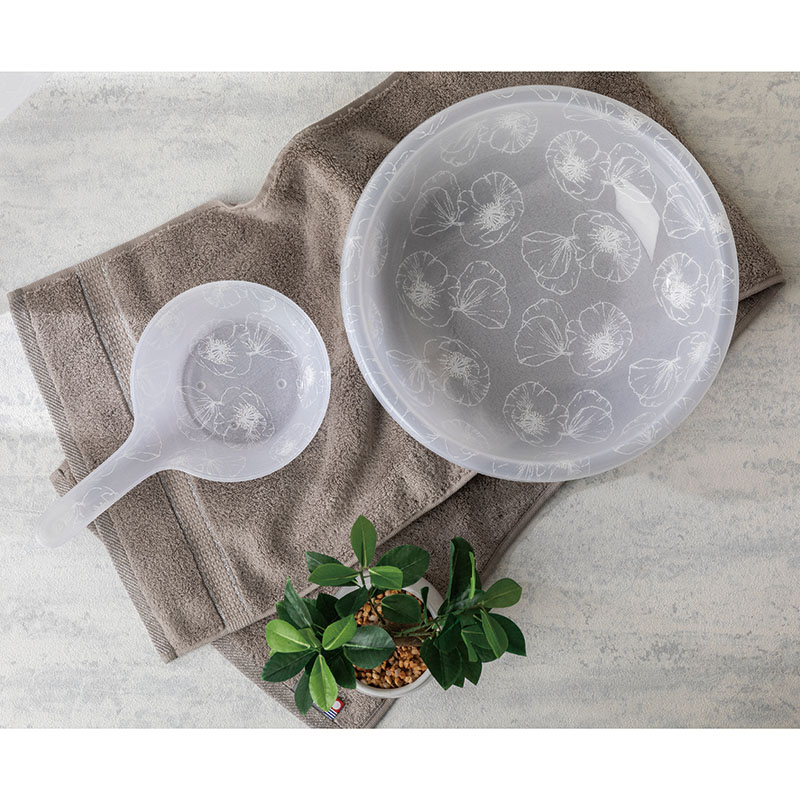 シンプルな色遣いにポピーの柄がはえる手おけです。