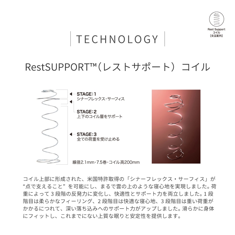 独自のレストサポートコイルによって、身体を面ではなく、【点で支えること】を可能にし、まるで雲の上のような寝心地を実現。