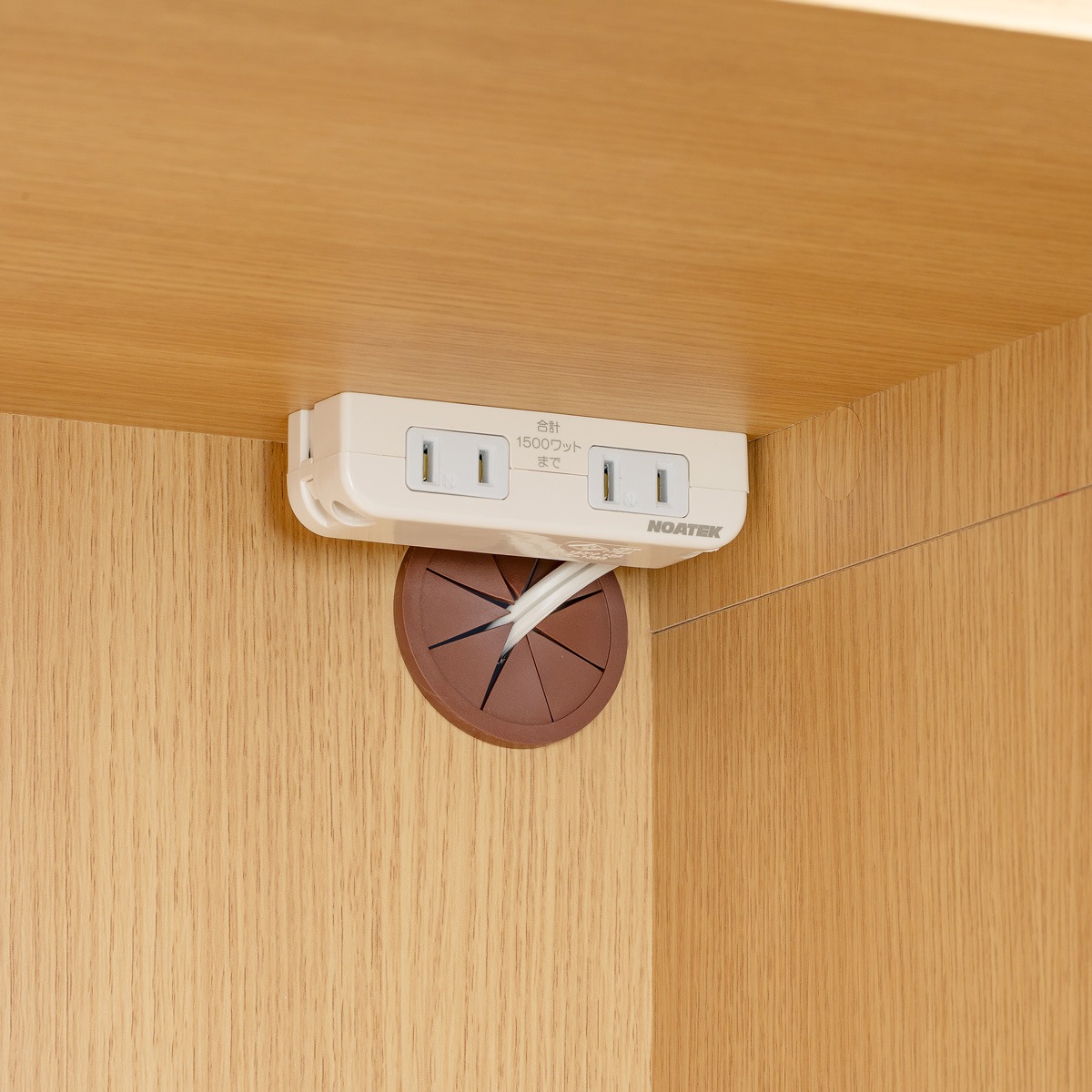 2口コンセントと配線用ゴムコーダーがついているので電源コードの長さを気にすることなく家電を収納していただけます。