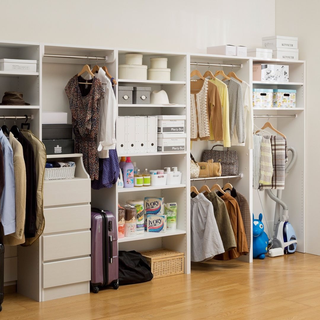 フリーラックと2種類のハンガーラックを組み合わせて、部屋をまるごとクローゼット収納にすることができます。