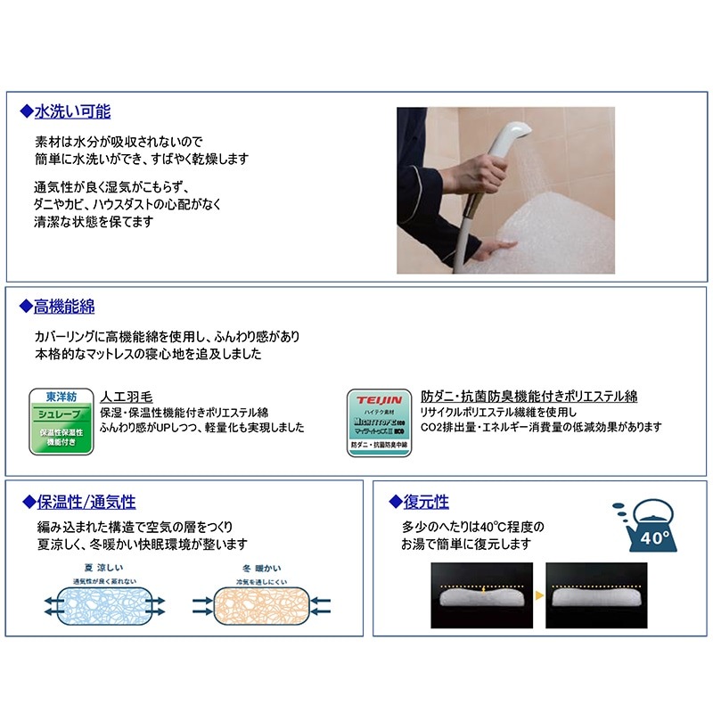 中材・カバーリングとすべて水洗い可能で、清潔で衛生的にお使いいただけます。