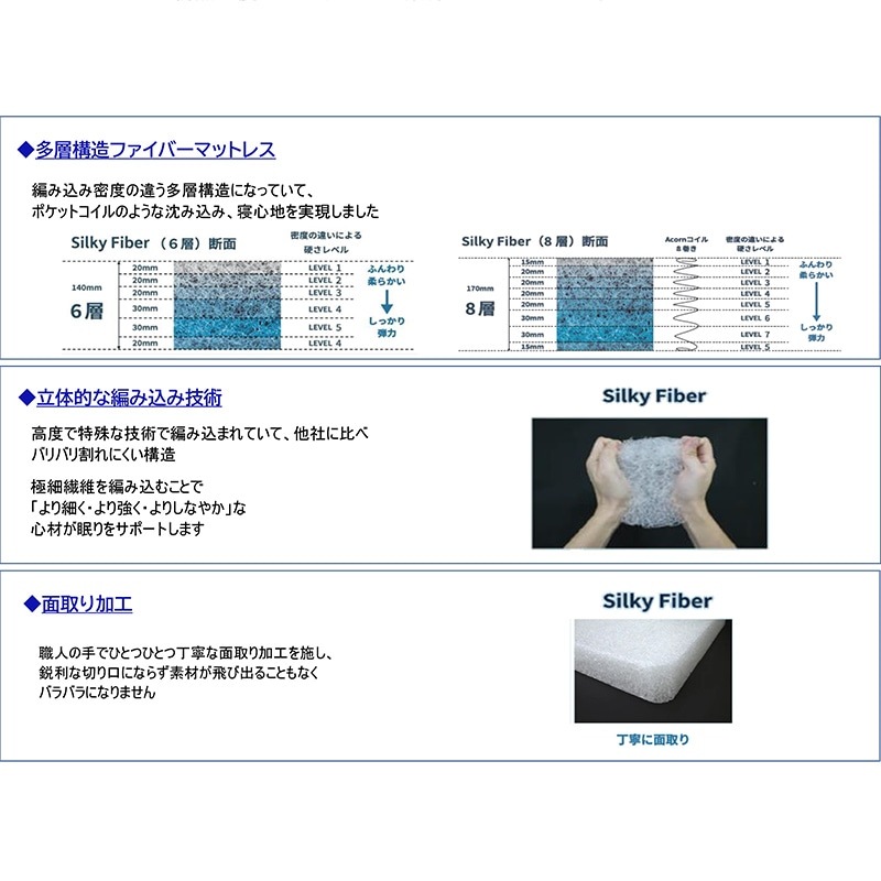 多層構造によりファイバーでありながら、ポケットコイルの奥行き感のある寝心地を再現。