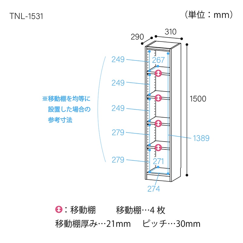 幅31cm、高さ150㎝のスリムタイプのフリーラックです。