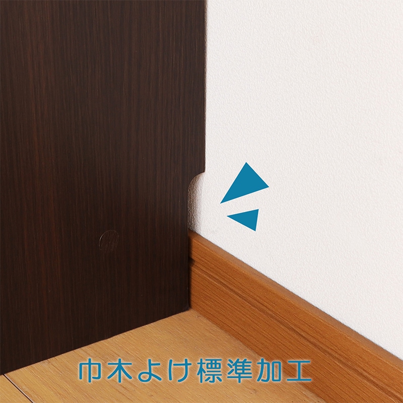 壁とラックの間に隙間があかないよう、巾木をよけるための加工がされています。