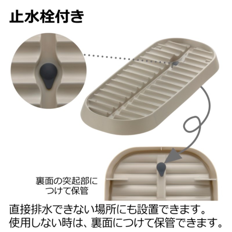 止水栓付きなので、直接排水できない場所にも設置できます。(止水栓を使用しない時は、裏面につけて保管できます。)