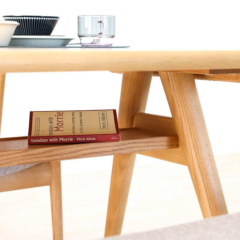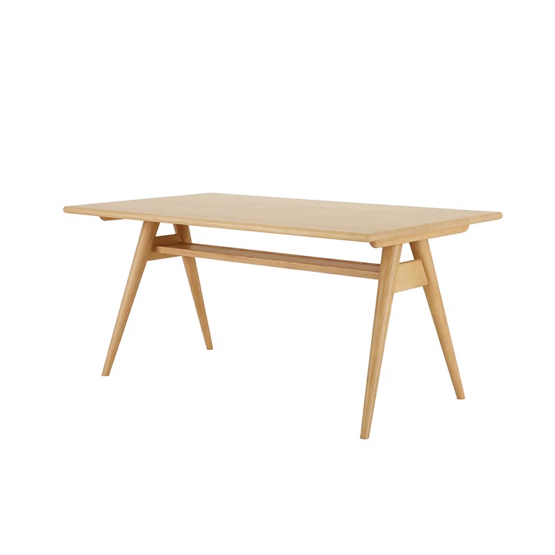 【テーブル】:「A」の字のようなハの字型の脚と、実用的な棚付き構造が特徴のダイニングテーブル。