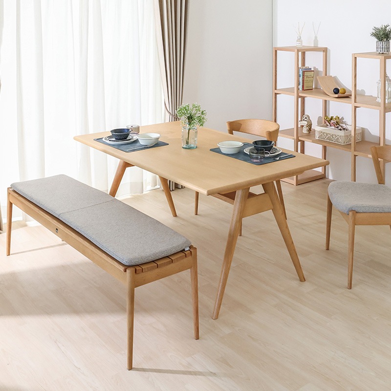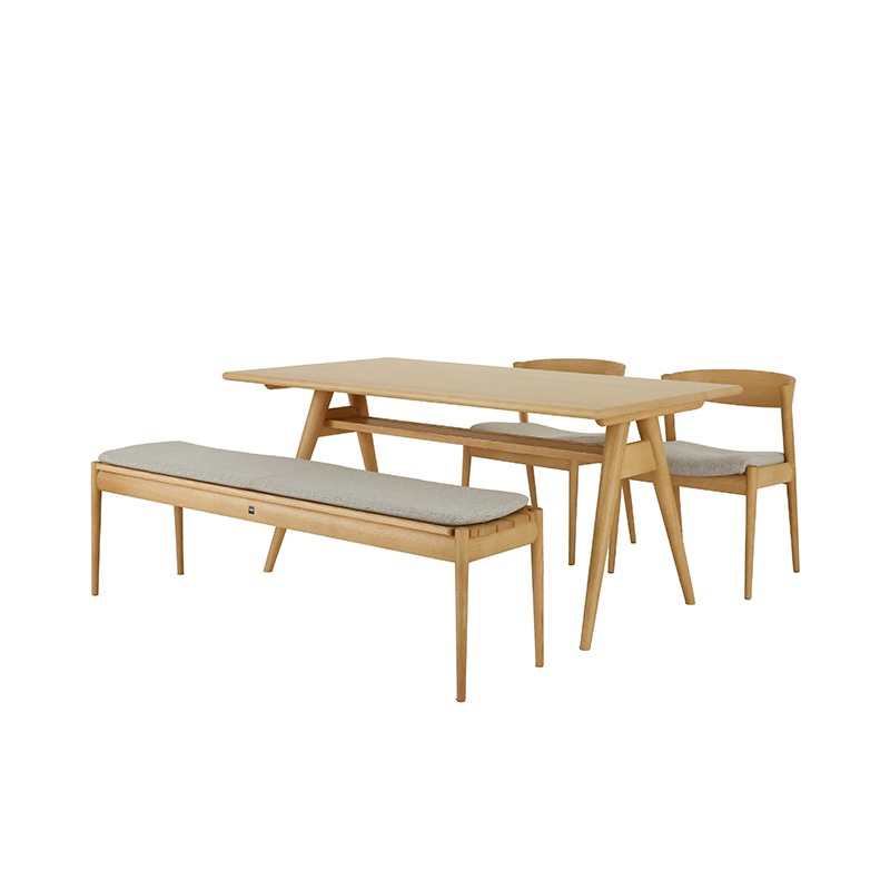 ダイニング4点セット(テーブルx1、チェアx2、ベンチx1、ベンチクッションx1)です(単品販売もございます)。