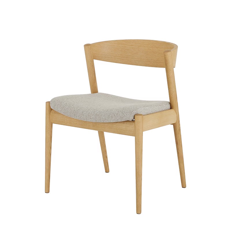 【チェア】:背もたれの曲線は、腰に優しくフィットし、ダイニングでの動きにも対応できるように手作業で削り仕上げています。
