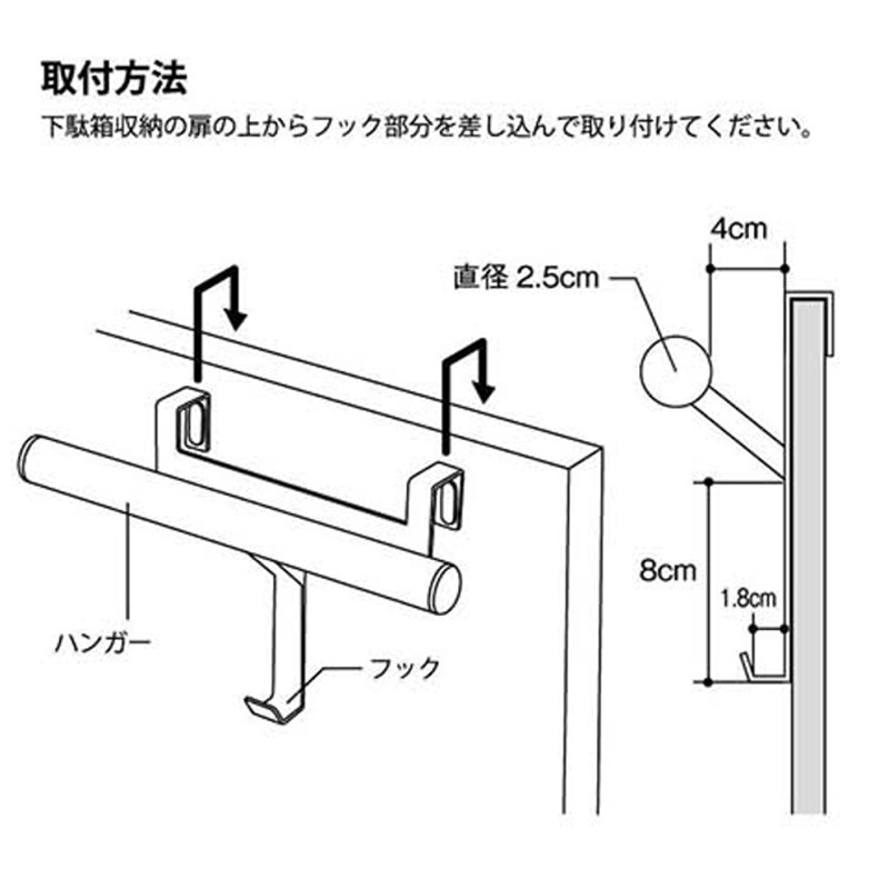 下駄箱の扉に引っかけるだけで設置できる便利なアイテムです。