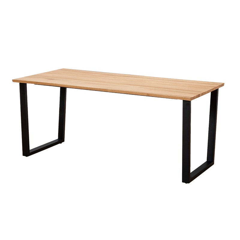 さらに、天板の裏側には反りを防ぐための加工が施されており、長く美しい状態を保ちながら安心してお使いいただけます。脚部には台形のアイアン素材を採用し、木の柔らかな風合いに無骨な力強さを加えることで、空間を引き締める洗練された印象に仕上げました。