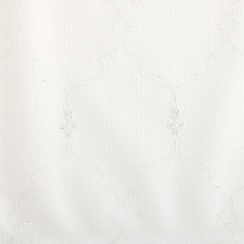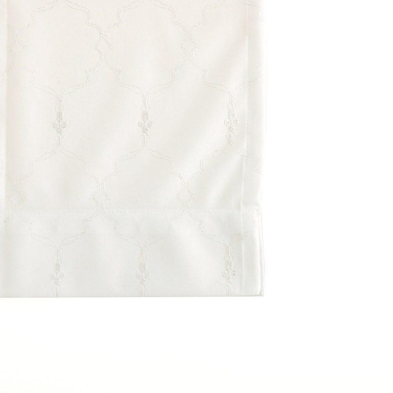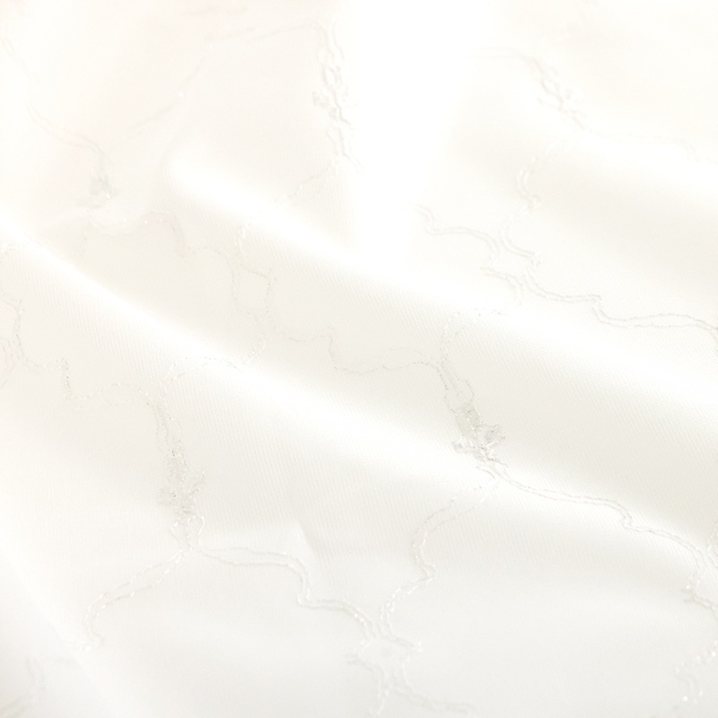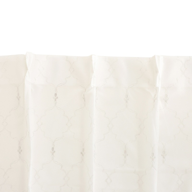 ラメ刺繍風の上品なデザインが光を柔らかく受け止め、窓辺にさりげない華やかさを添えるレースカーテンです。