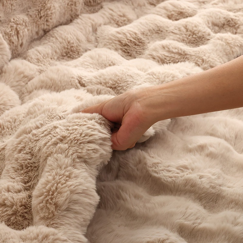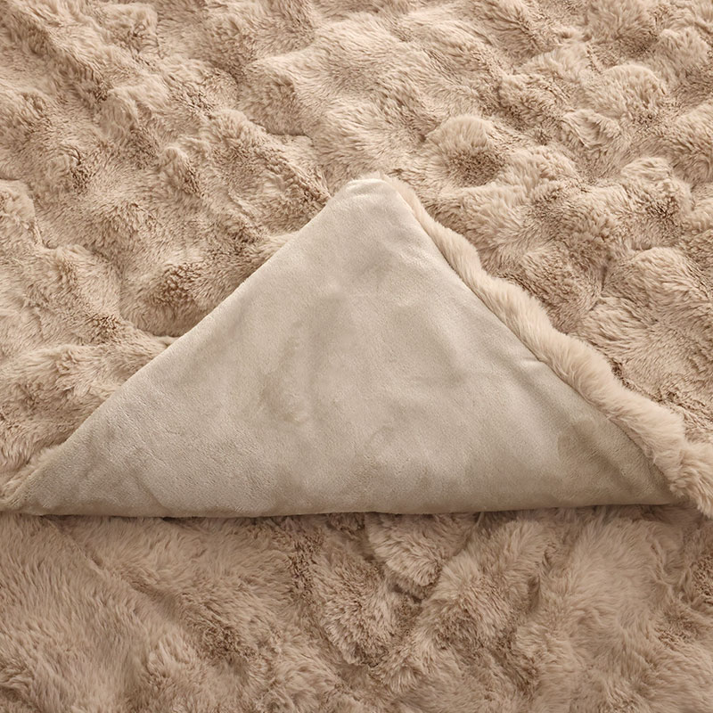 表地には毛足の長い凸凹加工のラビットファータッチ素材を使用し、指先が沈み込むようなふわふわの肌触りを実現しました。高密度の生地が生み出す優しいぬくもりは、一度触れると手放せなくなる心地よさです。