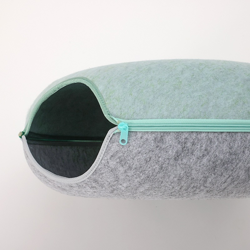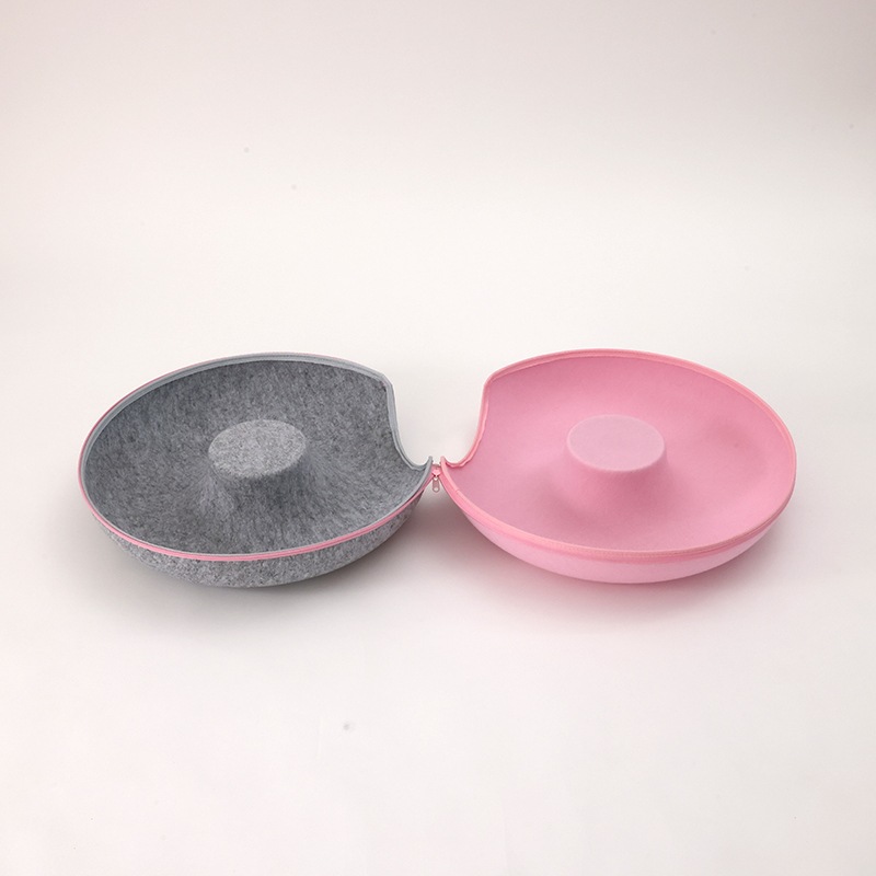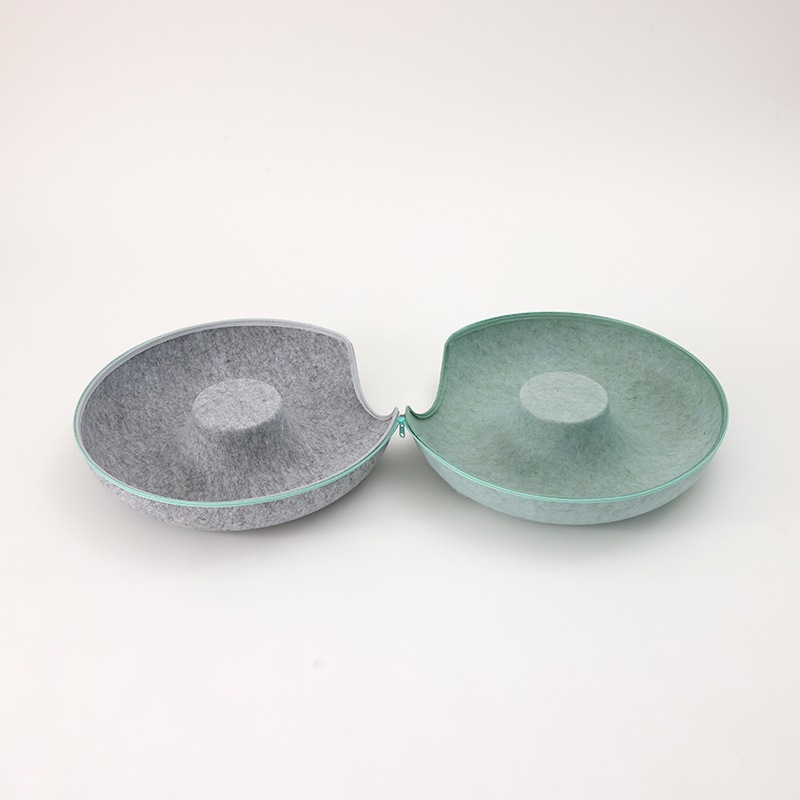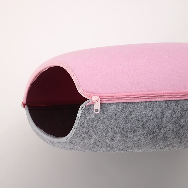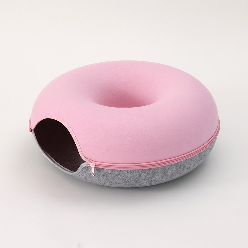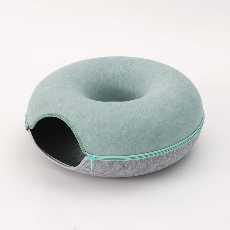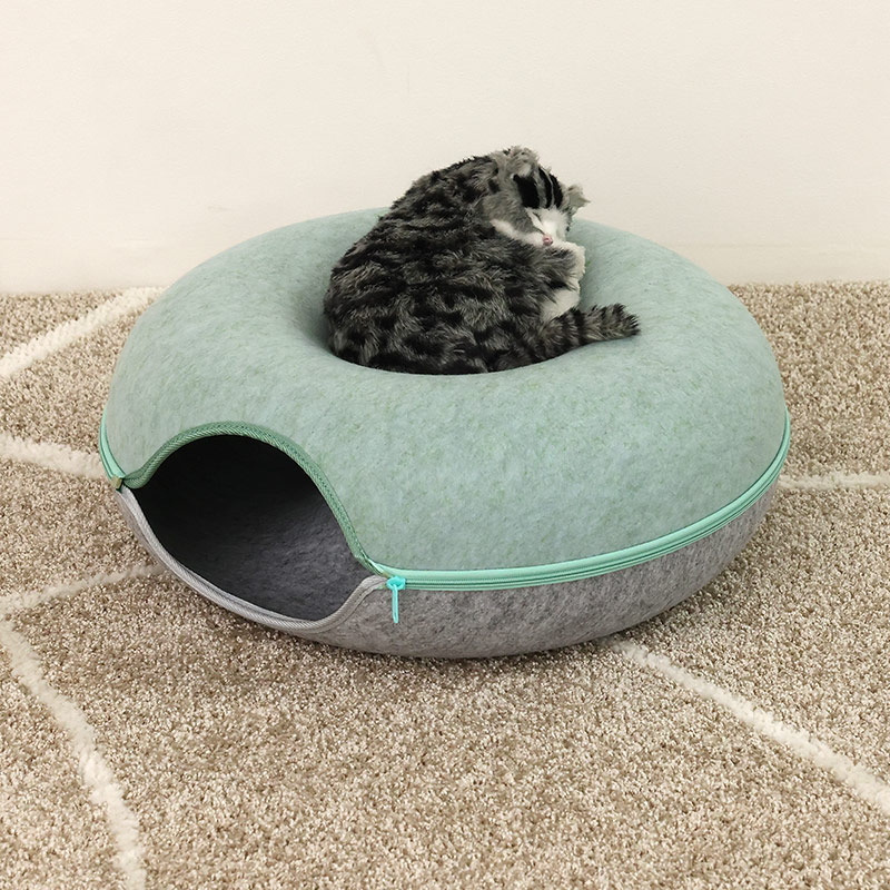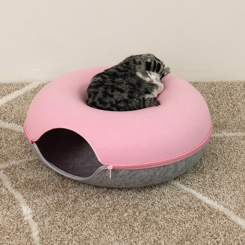硬めのフェルト素材を使用しているため、形が崩れにくく、縁に体を預けても安定感があり、猫が丸くなって眠る姿をしっかりと支えてくれます。ドーナツ型ならではの包み込むような形状は、狭い場所を好む猫の習性にもぴったりで、静かに落ち着ける居場所として心地よい時間を提供します。