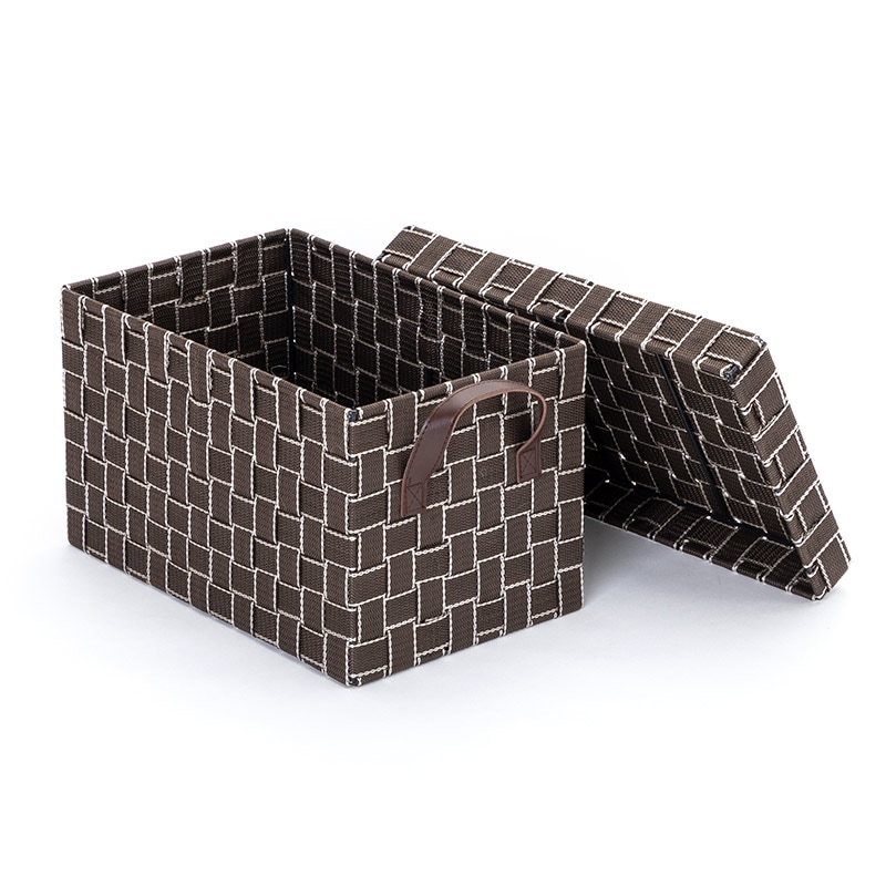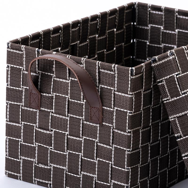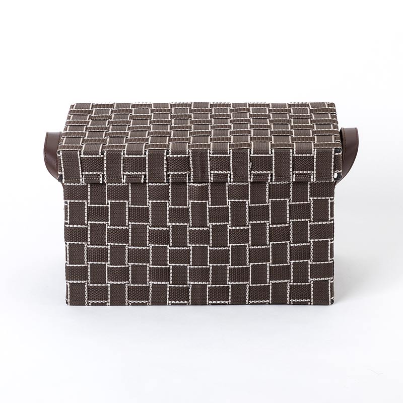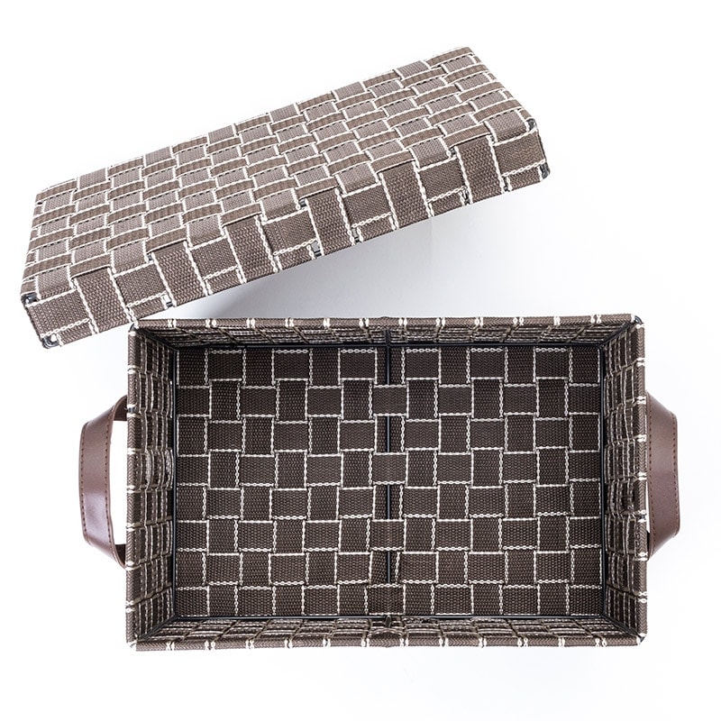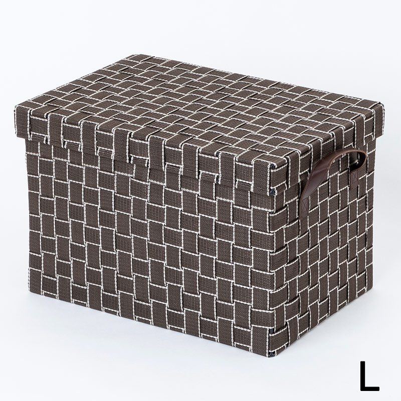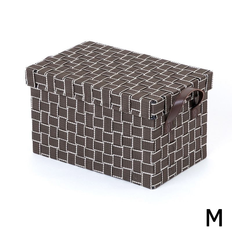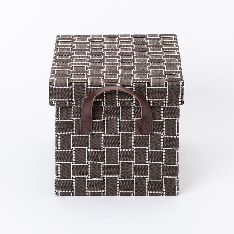 本体はスチールを使用したしっかりとした作りに、バンドを編み込むことで優しく収納物をしまうことができます。