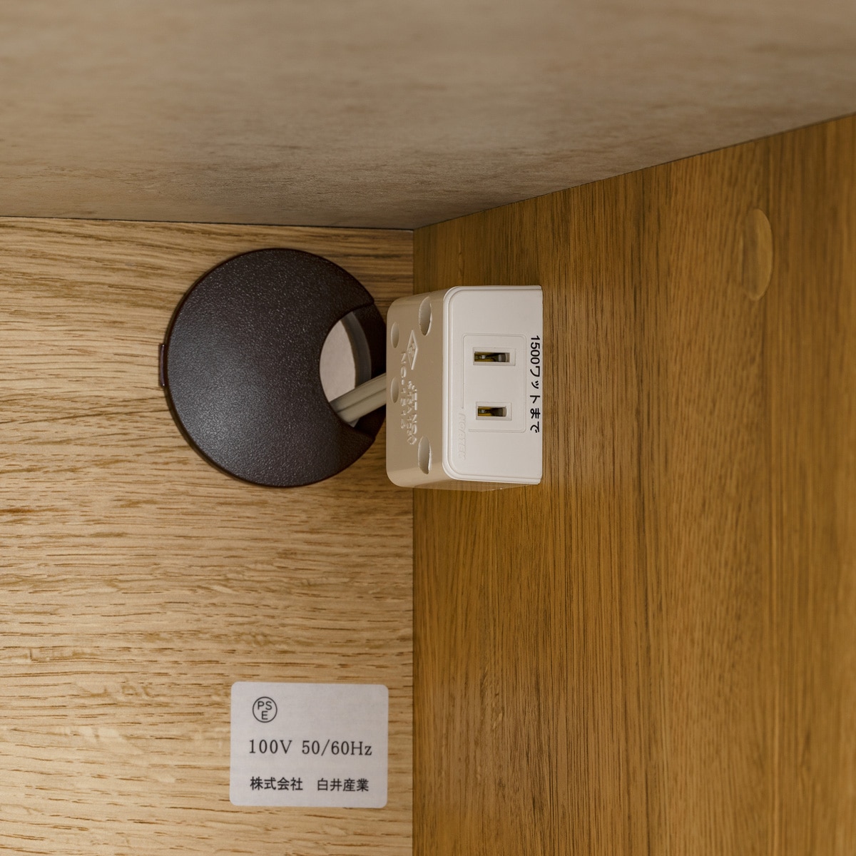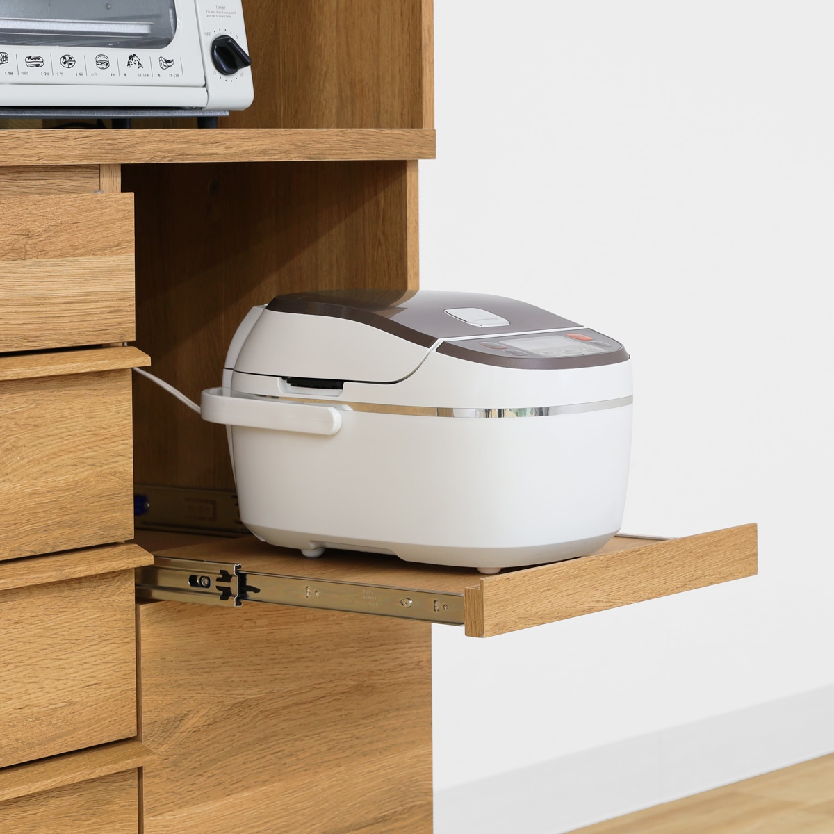 スライド棚上部には1口コンセントが付いています。電源コードの長さを気にすることなく家電を収納できます。