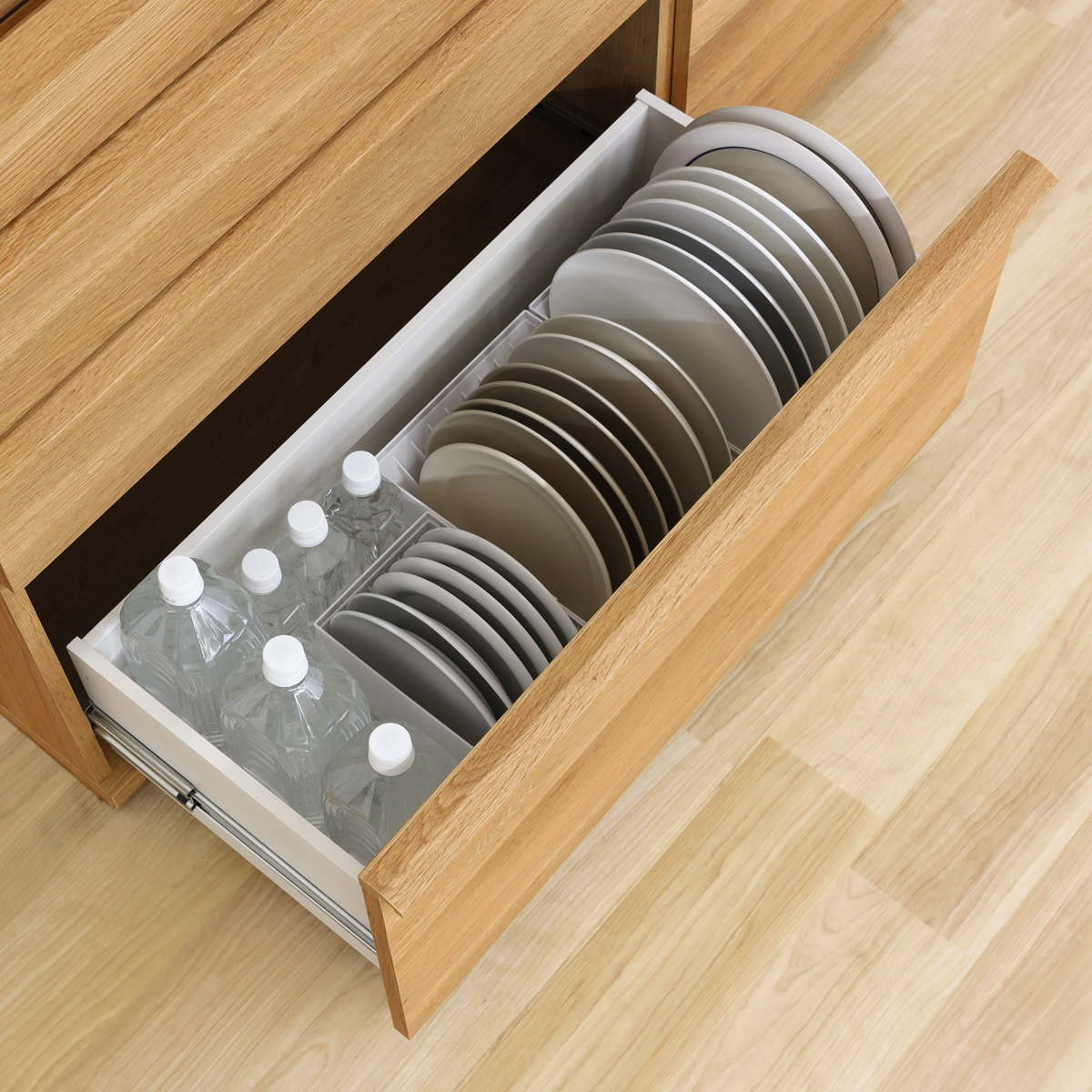 下段の引き出しは大皿を立てて収納できる有効深さ33.1cm。2Lのペットボトルも収納できます。