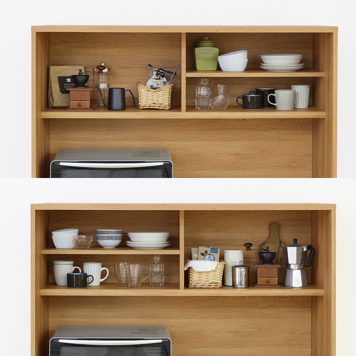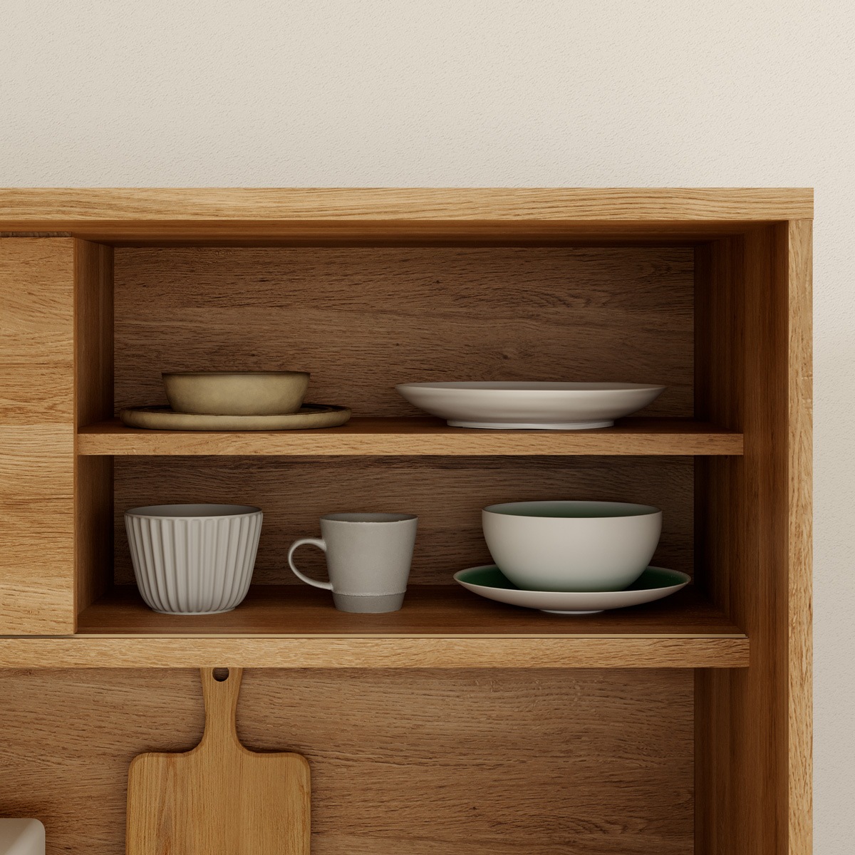 上部の扉は片側引き戸です。オープン部分にはお気に入りの食器をディスプレイして「見せる収納」を楽しむことができます。