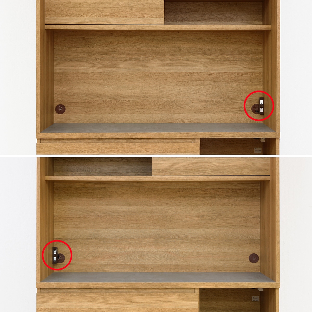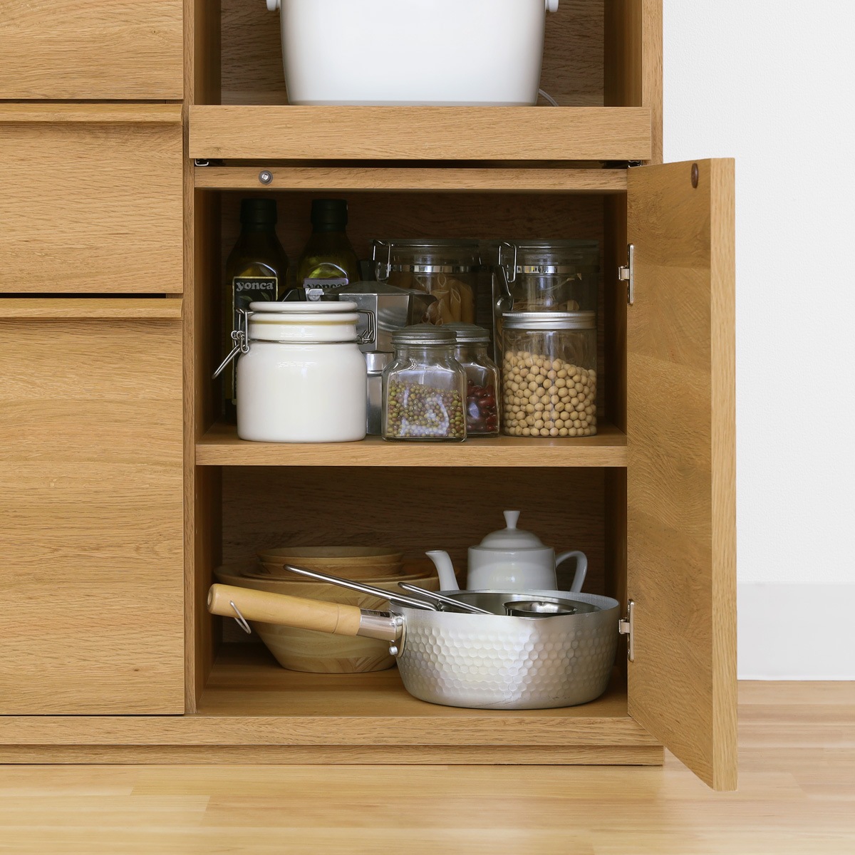 上部扉内にある1枚の棚板は、左右のどちらにも取り付け可。キッチンの配置や収納物に合わせて選択できます。