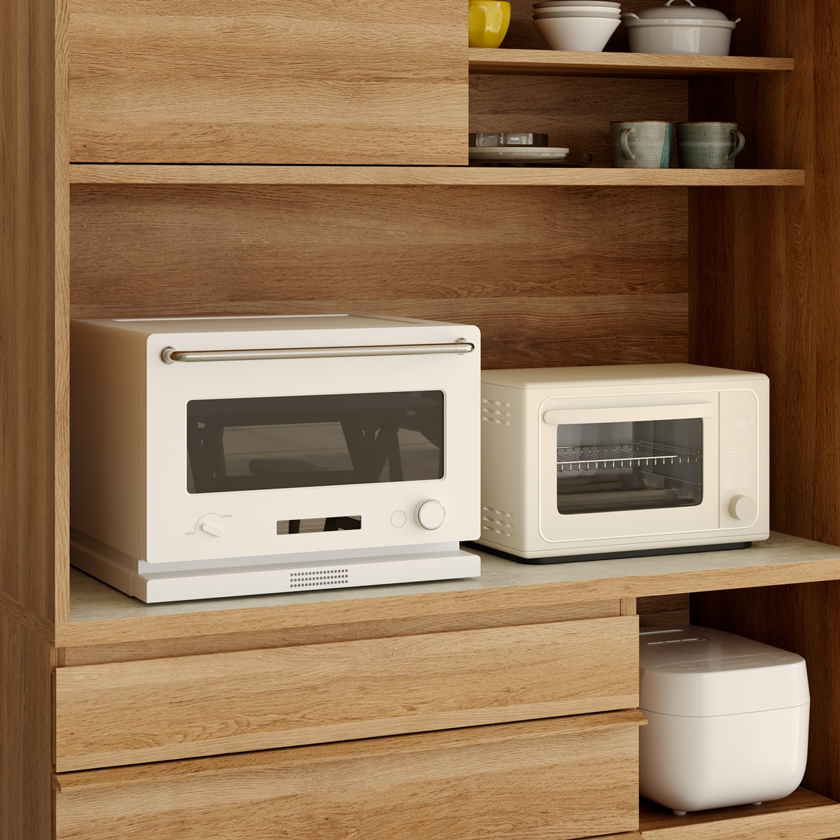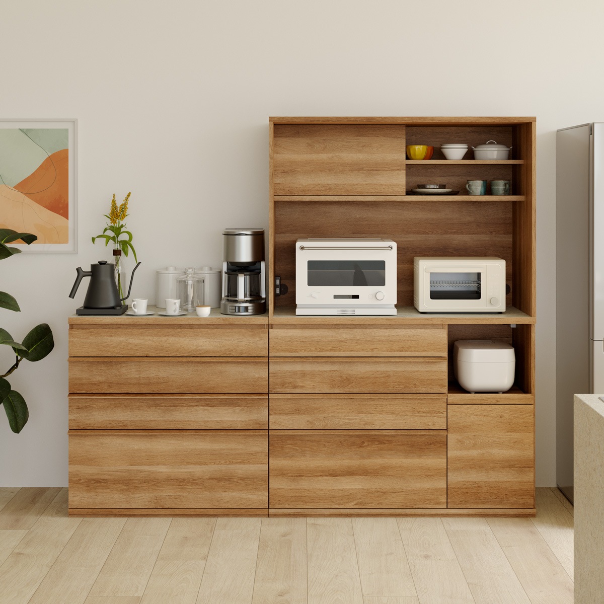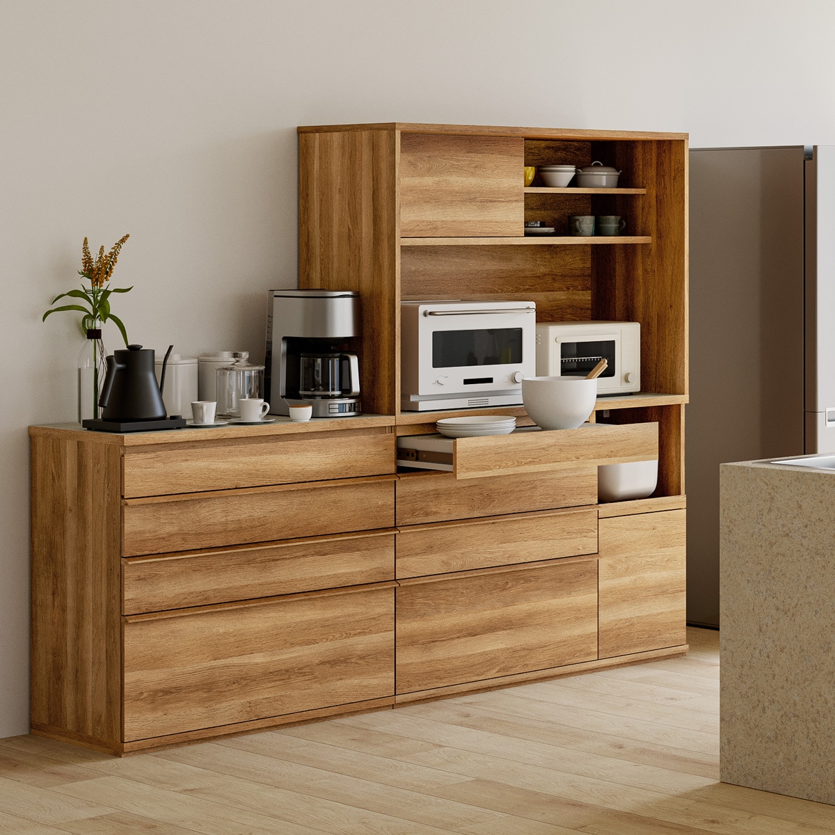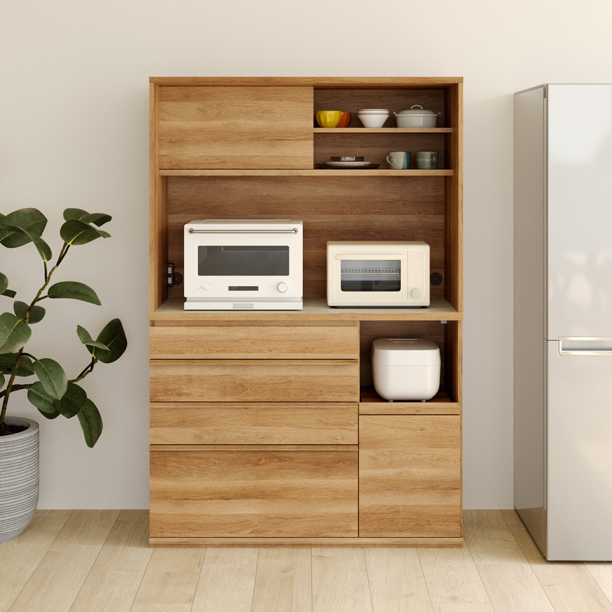 引き出して使えるスライド棚付き棚を引き出して、キッチン家電をスムーズに使うことができます。