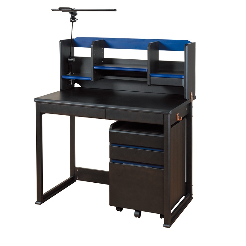 ブラックを基調にブルーのアクセントを効かせた学習デスクは、空間を引き締めつつ成長後も使い続けやすいデザインです。