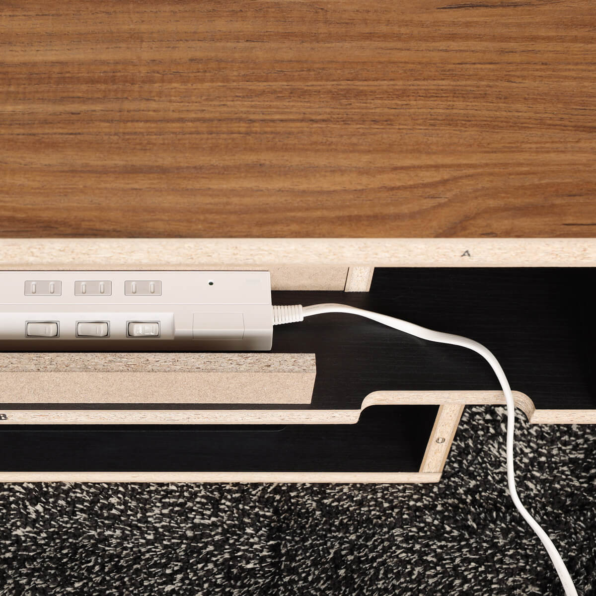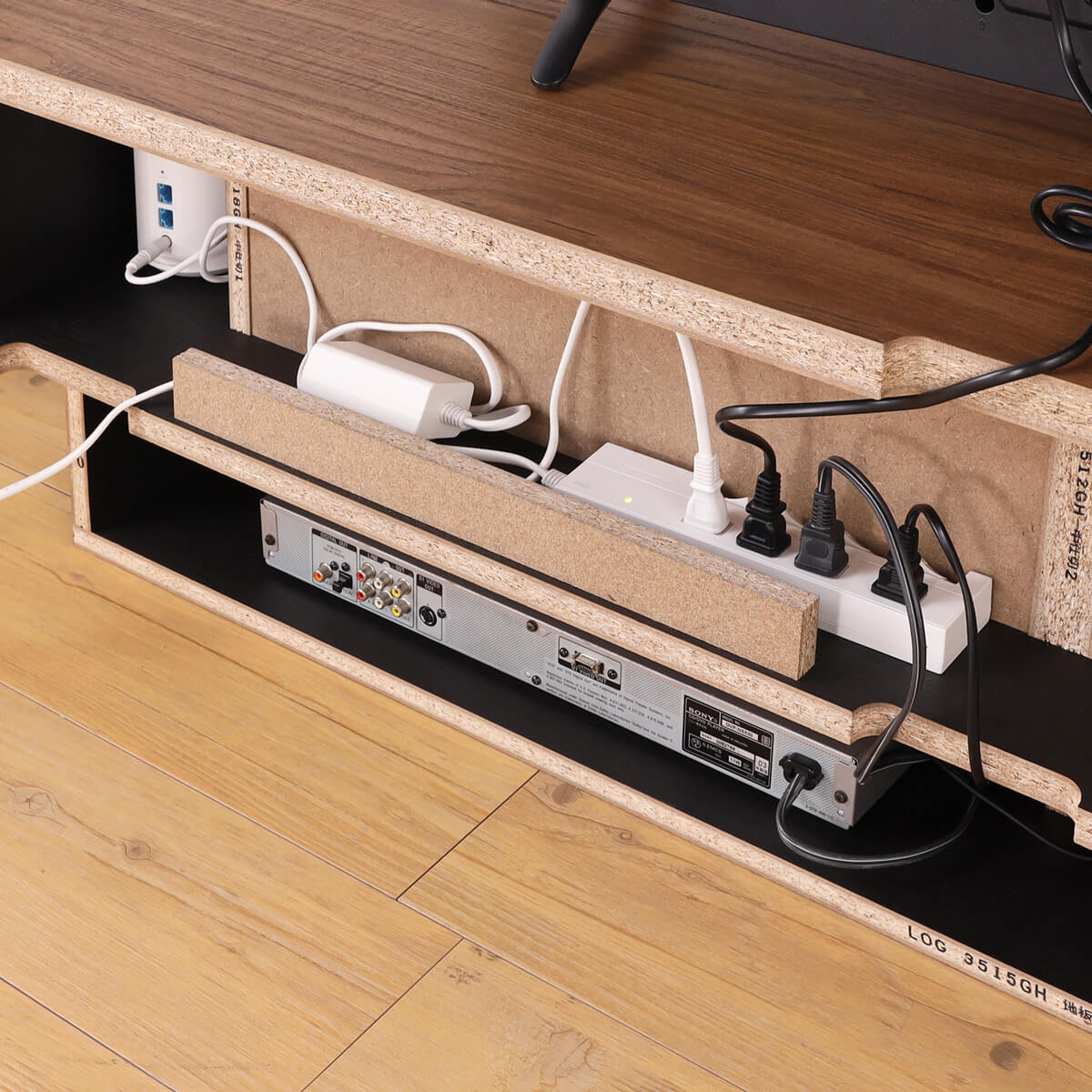 電源線をひきやすくキレイに収納できるように、電源タップの収納ゾーンや配線穴を設けているので、テレビ台裏の配線もきれいに片づけられます。