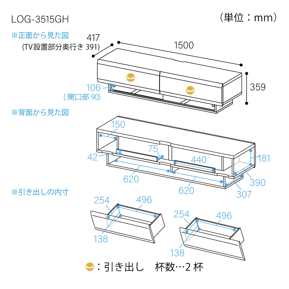 大型テレビに対応する幅約150cmで、65V型までのテレビが置けます。