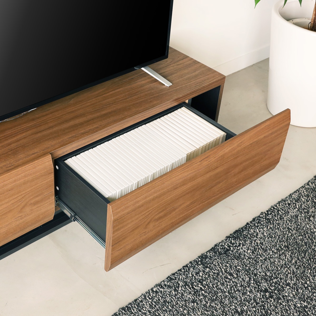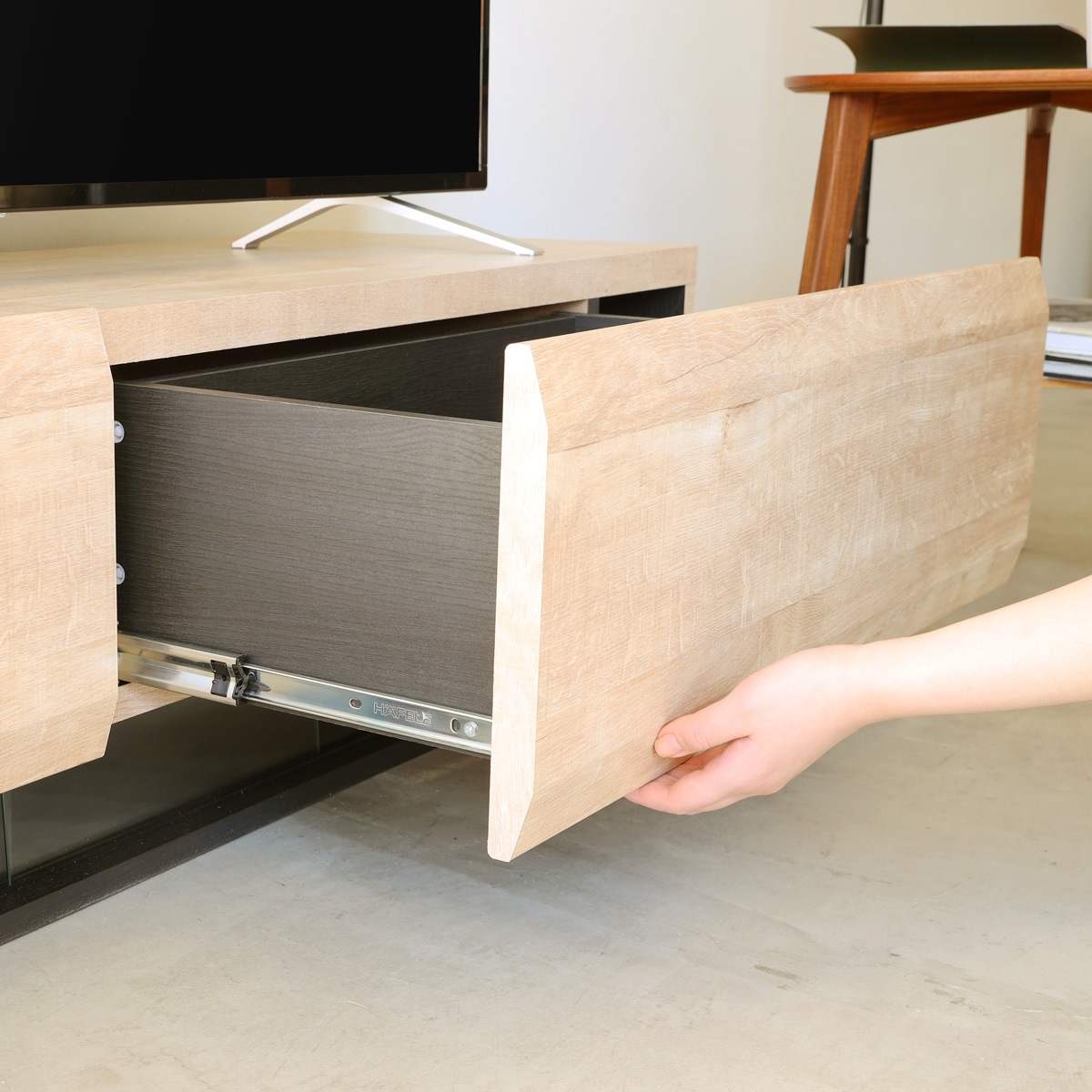 BDやDVDプレイヤーの収納は、引き出しの下にあります。引き戸はガラス戸を採用しているので、リモコンの通りも問題ありません。