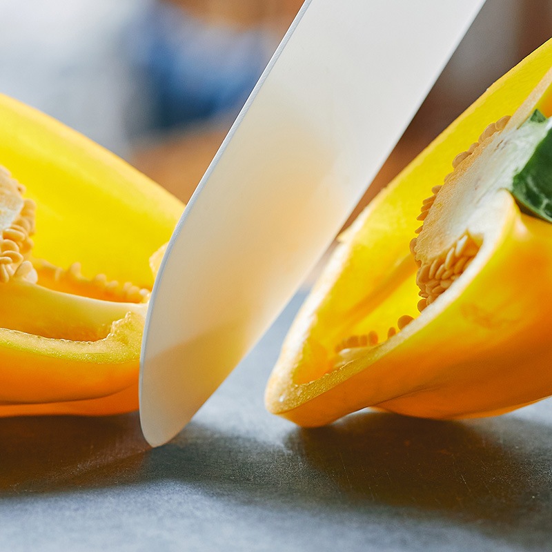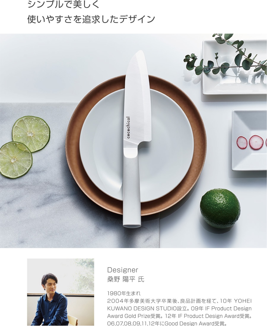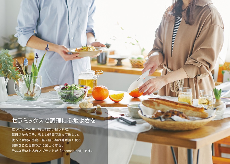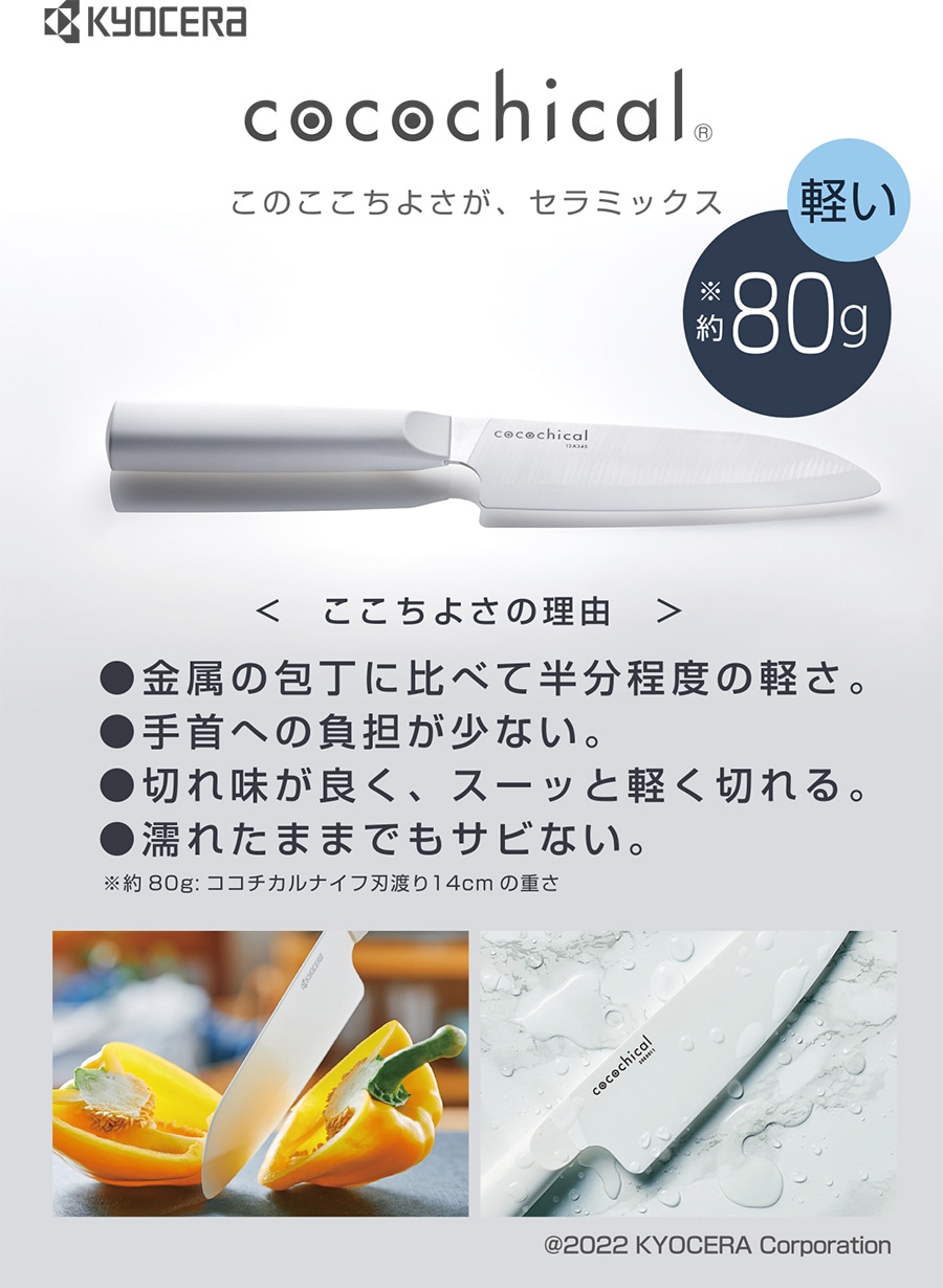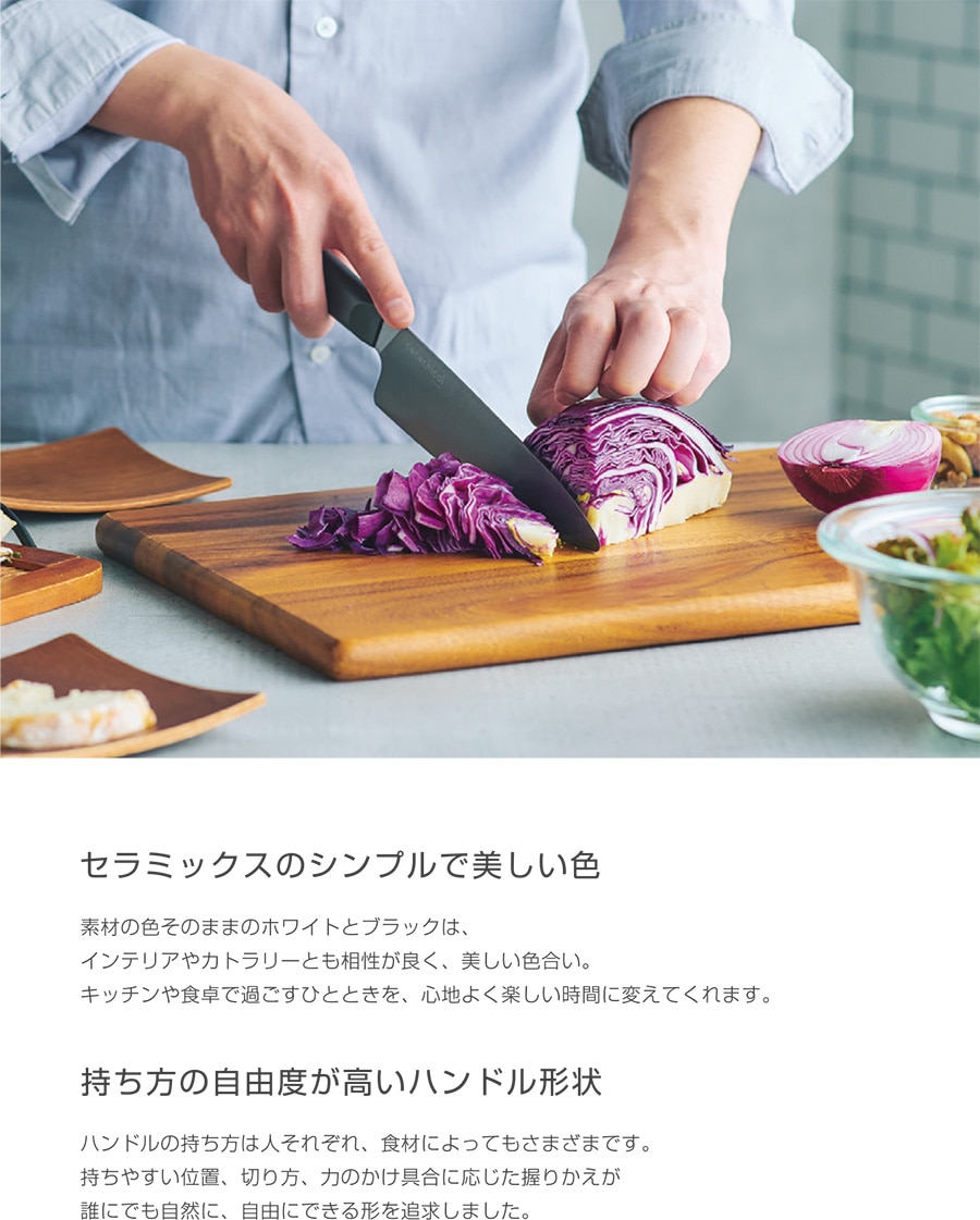 ● とても軽く、さっと気軽に使える持った瞬間に驚く "軽さ" 。重量は一般的な同程度サイズの金属包丁の約半分で、長時間使っても疲れにくい。