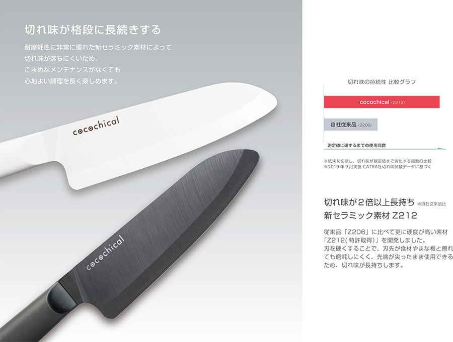 ●鋭い切れ味が長続き秘密は、17年ぶりに刷新した新素材。刃を硬くすることで、刃先が食材やまな板と擦れても磨耗しにくく、先端が尖ったまま使用できるため、切れ味が長持ちします。